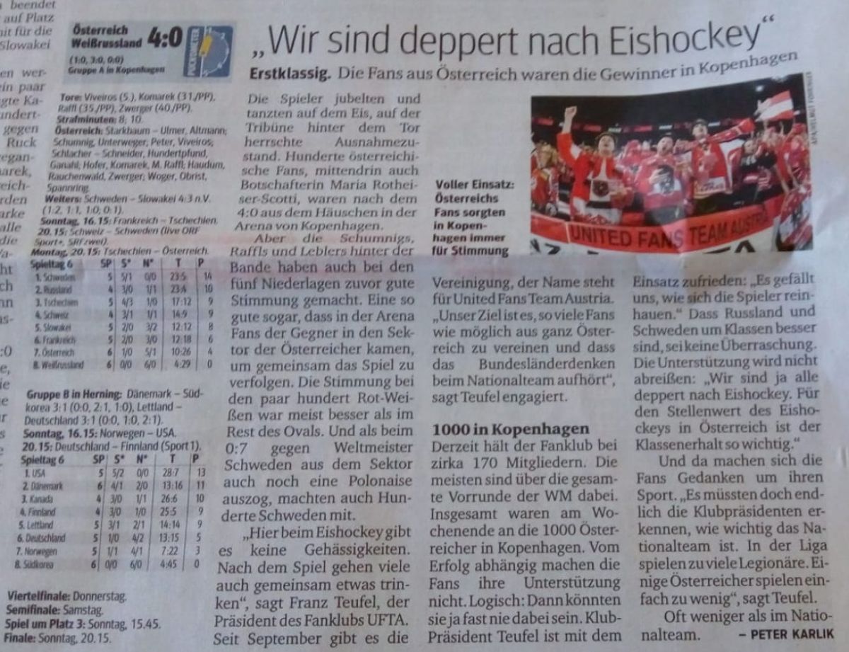 Im Fan-Sektor der Österreich war immer gute Stimmung. Getreu dem UFTA-Motto "9 Bundesländer - 1 Team" war im Österreich-Sektor bei jedem Spiel der Zusammenhalt erkennbar. Sehr gefreut hat uns auch, dass immer wieder auch Fans anderer Nationen in den Österreich-Sektor gekommen sind, um gemeinsam mit uns eine Eishockey-Party zu feiern. So muss Fankultur sein und dafür steht UFTA!