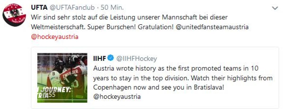 In der nachstehenden Facebook-Grußbotschaft des Österreichischen Eishockey Verbands fasst unser Hasi das Resümee der UFTA Fans zu dieser Eishockey-Weltmeisterschaft super zusammen ...