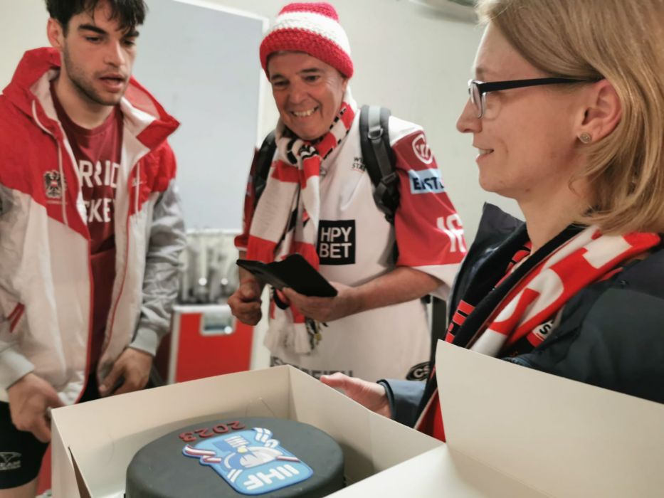 Nach dem Spiel erfolgte dann auch noch eine Tortenübergabe mit dem WM Logo 2023 an die Spieler, welche ihnen hoffentlich auch eine süsses Lächeln beim verzehren bereitet. Auch dafür unser großer Dank an die Mitglieder Julia und Finki!